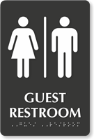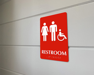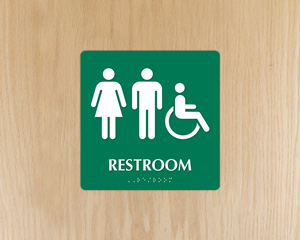 • • Our restroom signs comply with ADA signage requirements with raised letters, California Grade II Braille, symbols for enhanced accessibility.