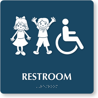 • • Our restroom signs comply with ADA signage requirements with raised letters, California Grade II Braille, symbols for enhanced accessibility.
