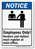 • • Our varied selection of Visitors Must Register Signs and Visitors Must Report To Office Signs allows you to instruct people to sign in, point them in the right direction, or set rules while visitors or vendors are on your property.