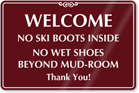 Ski boots can track in snow and mud, potentially damaging floors and carpets. Sign is a perfect reminder to be mindful of footwear and maintain a clean and orderly living space.