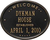 A highly unique personalized plaque that commemorates weddings, anniversaries and other special dates. Constructed from sturdy cast aluminum, this durable Welcome Oval House Standard Wall Plaque can be mounted indoors or outdoors, and ensures years of dependable service.