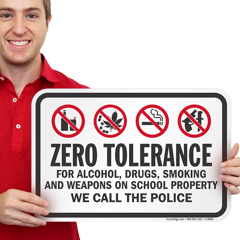 Clearly state your school regulations using this School Safety sign. Make sure that everyone is aware of the zero tolerance policy for alcohol, drugs, smoking and weapons on the school property. The sign also states that police will be called on violation of rules.